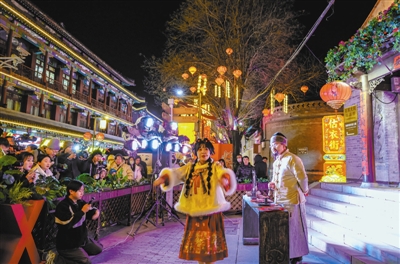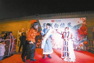 据介绍,元旦期间,一系列以“寻吉”为主题的互动活动在杨柳青古镇同步上演。《寻找白俊英》是今年古镇活动的重头戏,游客加入到“寻找”年画仙子白俊英的队伍中,到多个快闪与情景剧目的点位上参与打卡。