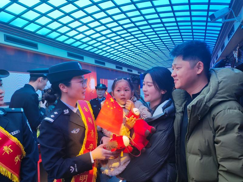 1月10日,北京铁路公安局天津公安处民警在天津北站,走上开往北京站的“津旅时光号”列车上,开展庆祝中国人民警察节宣传活动。