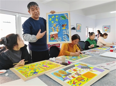 北辰农民画家丰爱东(左二)为美术爱好者讲农民画的创作技巧。