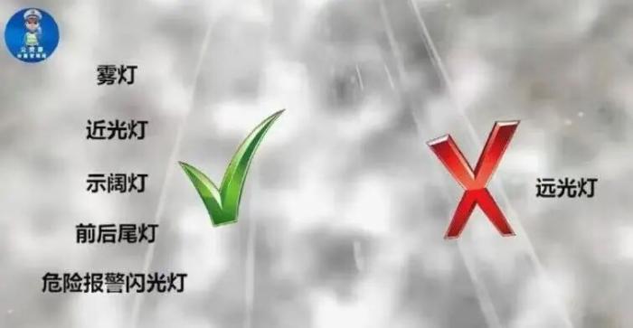 亮尾:全程开启近光灯 + 示廓灯 + 双闪灯,勿用远光灯(易被雪雾反射影响视线)。
