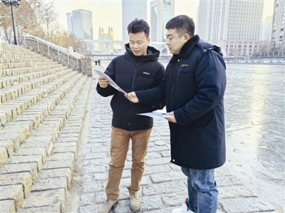 1月17日是“四九”首日,昨天上午开始零星飘落雪花,记者跟随天津市水务局海河管理中心(以下简称海河中心)河道环境科副科长骆星辰一行,沿着天津之眼(永乐桥)、狮子林桥、金汤桥、国泰桥等重点河段开展巡河工作。每到一处,巡查组都仔细排查冰面隐患,并向沿途市民发放冰面安全防溺水宣传单,耐心讲解冰面安全知识。