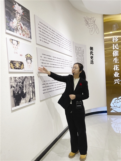 “明朝永乐年间有一道指令,令中原和江南各省向经济带移民,从而建立起了曹子里一个个村落。他们用爱与双手打造了人间烟火,同时也塑造了人间之美——花艺。”在武清区曹子里镇绢花文化展厅里,“90后”讲解员李丹的指尖轻轻拂过墙上的绢花,徐徐介绍着。