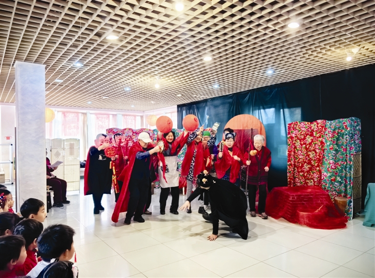 舞台上精彩的戏剧正进行到关键时刻,舞台下,孩子们瞪大了眼睛,表情紧张又兴奋——台上的“演员”是自己的爷爷、奶奶、姥姥、姥爷,他们是南开区奥兹久华里幼儿园里的“老小孩儿”。