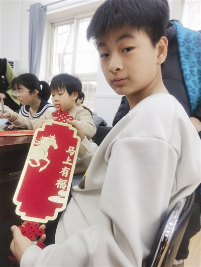 渐渐地,略显生涩的动作变得流畅。剪刀穿梭,金布流转,不多时,一件件独一无二的作品相继出炉:有的“马上有福”挂饰骏马矫健、福字圆润;有的生肖马剪布作品灵动俏皮、憨态可掬。孩子们举起作品,相互比较、欣赏,爱不释手,每一件金灿灿的作品,都成了这个冬天最特别的印记。