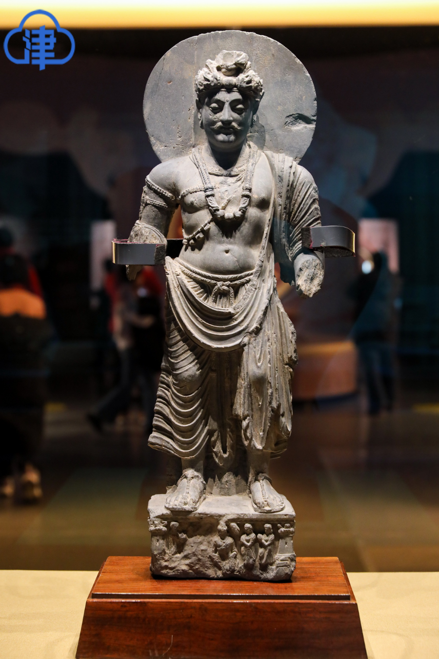 犍陀罗展天津博物馆历史研究部策展人尹航介绍,“犍陀罗(本意‘芬芳遍地’,佛经中也译为‘芳香之国’)位于巴基斯坦北部白沙瓦河谷到印度河东岸以及阿富汗喀布尔河谷东部一带。犍陀罗艺术流行于公元1至6世纪,是古希腊艺术与印度艺术相结合而形成的特殊样式,堪称古代东西方文化交融的典范。其注重对人体比例、肌肉和骨骼结构的准确描绘,造像具有强烈的真实感。其面部呈椭圆形,眉目端庄,鼻梁高挺笔直,眼窝深邃,嘴唇薄而富有线条感,头发通常为波浪式卷发,明显具有欧罗巴人面部特征,衣褶流畅而写实。同时又对人物形象进行了理想化处理,赋予造像以神圣、庄严和宁静的气质,有一种超凡脱俗的美感。”