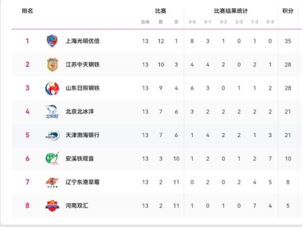 在A级常规赛第13轮比赛中,天津女排主场3-1逆转战胜辽宁队,山东女排主场3-1战胜江苏女排,上海女排客场3-0横扫北京女排,福建女排主场3-1战胜河南女排。