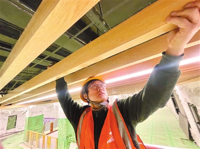 中铁建大桥局施工人员在地铁8号线梅江道东站进行站内装饰装修。 记者 张磊 摄