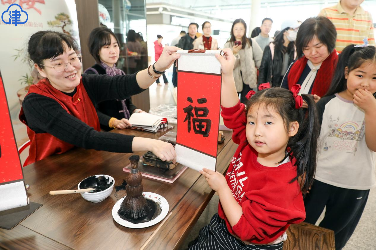 航班客舱变身“空中文化展厅”,旅客在云端就能沉浸感受天津风貌。机场出发大厅里,杨柳青年画、泥人张彩塑等非遗项目现场展示,旅客和媒体记者还能亲手体验年画印制,触摸传统技艺的温度。