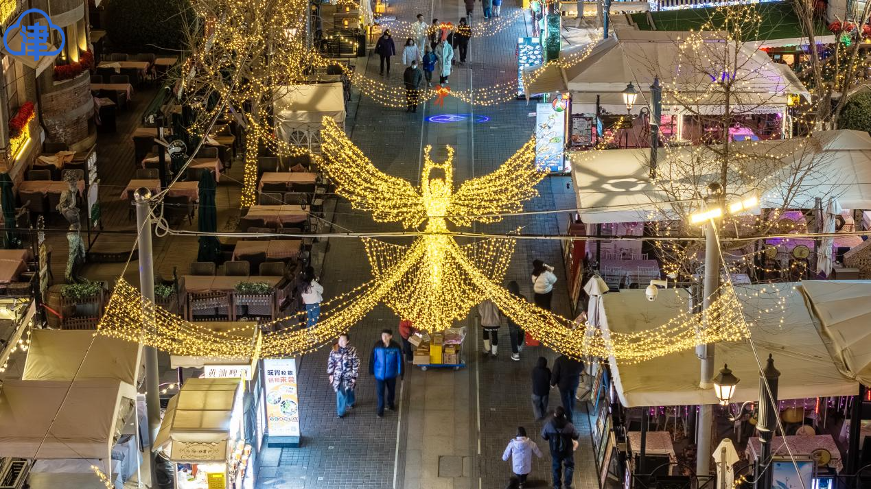 马可波罗广场的核心景观尤为吸睛,以百年和平女神雕塑为原型打造的造型灯光,在地灯与投影射灯的交织下,暖黄、浅金的柔和光晕勾勒出女神羽翼舒展、橄榄枝轻扬的温婉模样,让承载历史记忆的雕像在夜色中传递出温暖的和平寓意。广场上,复刻1928年风貌的环形冰场冰面晶莹,市民游客脚踩冰刀环绕灯光滑行,尽显冬日乐趣。