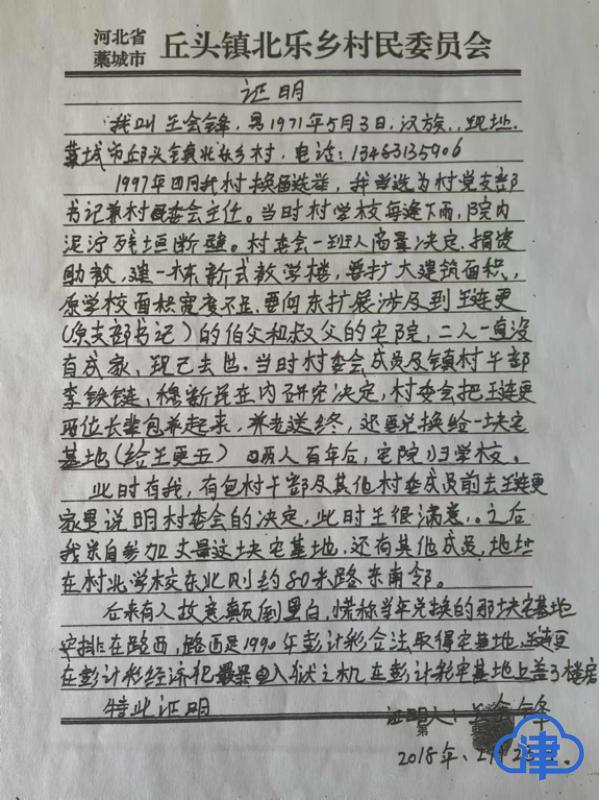 “调查取证时,裕华区人民法院的法官带人到村里,仔细查看了我家宅基地的位置和王连更盖房子的位置。”彭计彩回忆道,庭审中,王连更拿出一份1997年10月31日的协议,声称自己是通过与村委会签订协议获得的该宅基地使用权。