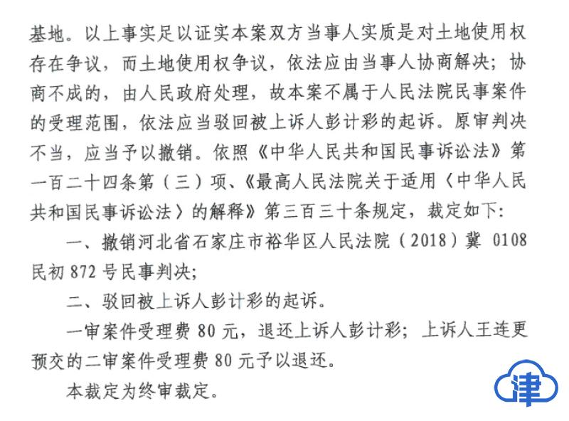 “我们本来以为终于能要回自己的地了,可王连更不服一审判决,又上诉到了石家庄市中级人民法院。”彭计彩无奈地说。2018年12月,石家庄市中级人民法院作出判决,撤销了一审判决,驳回了他的起诉。