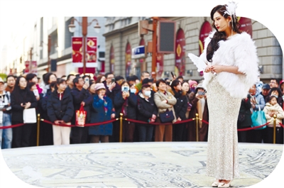 身着旗袍的“陈白露”一登场,人群中立刻爆发出雷鸣般的掌声与欢呼声。青年演员王知羽循着历史脉络款款走来,她已在此演出50多场《日出》,“户外演出受众更广泛,有不少外地游客和戏剧‘零基础’观众,能让经典艺术普及、为城市引流。”演员们以真挚情感复刻时代风貌,360度开放舞台上,市井喧嚣与剧情交织,游客围得里三层外三层,沉浸式感受着角色的爱恨情仇与时代脉搏。