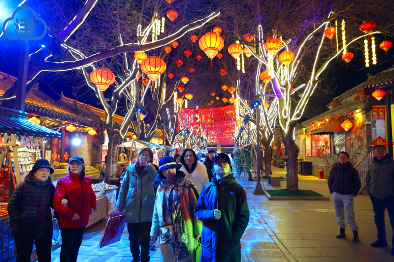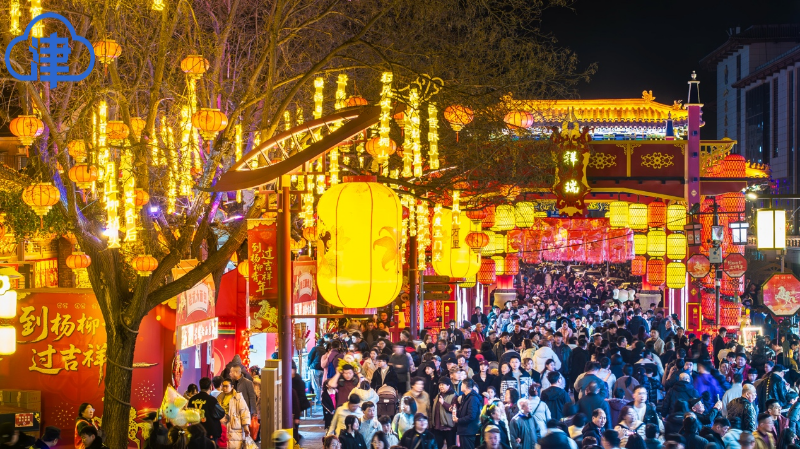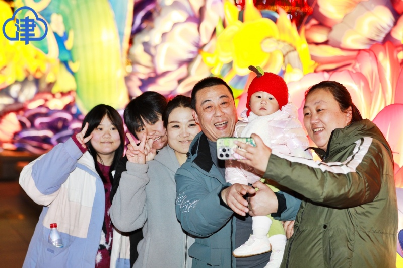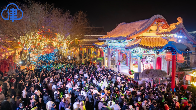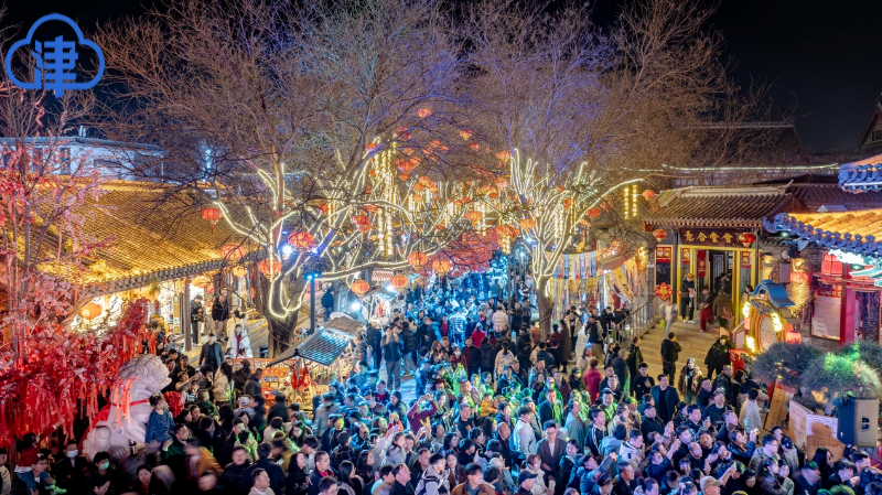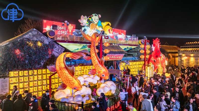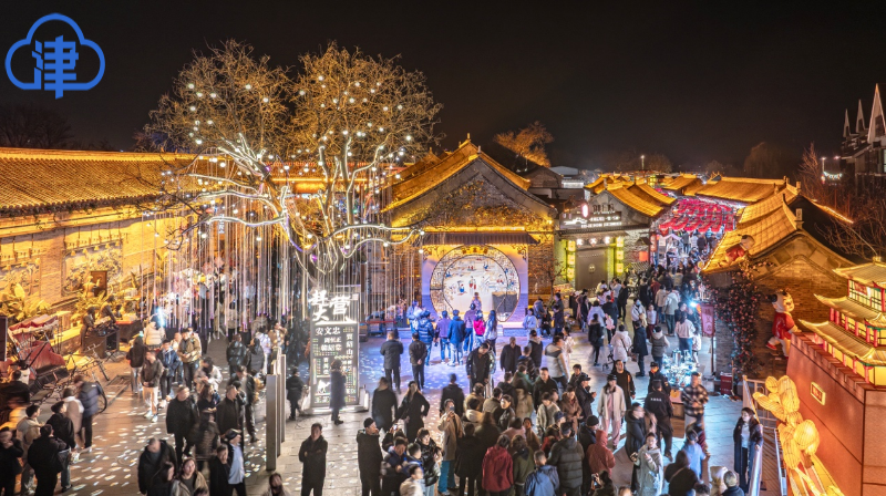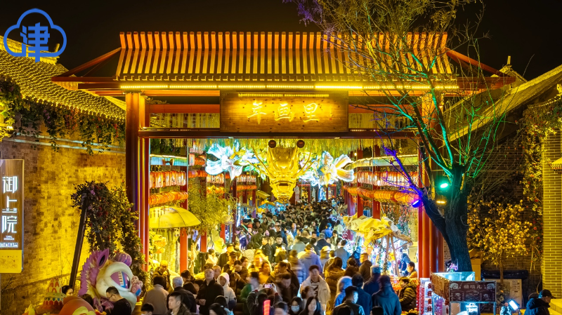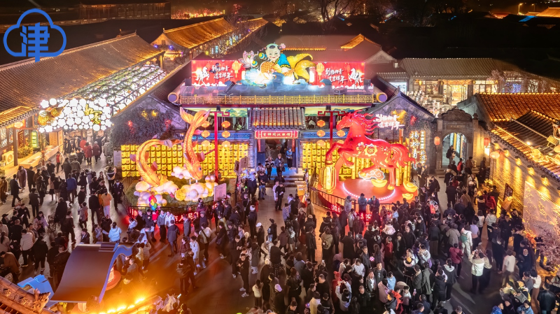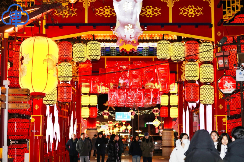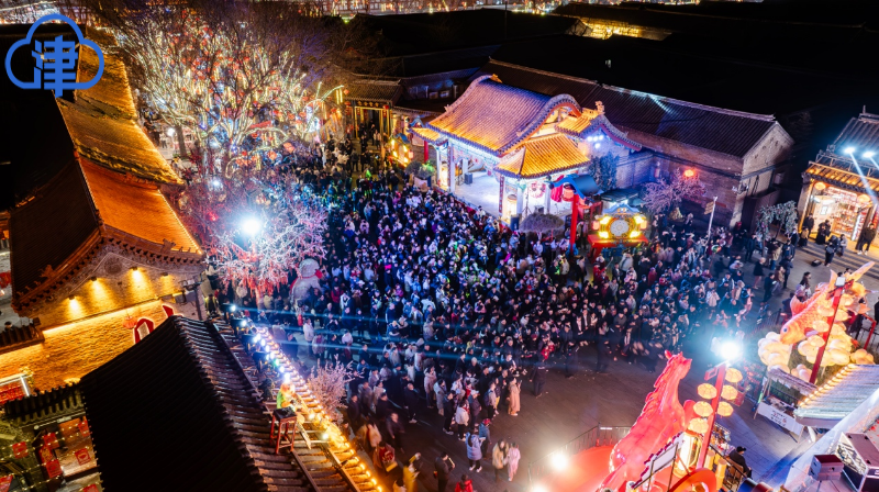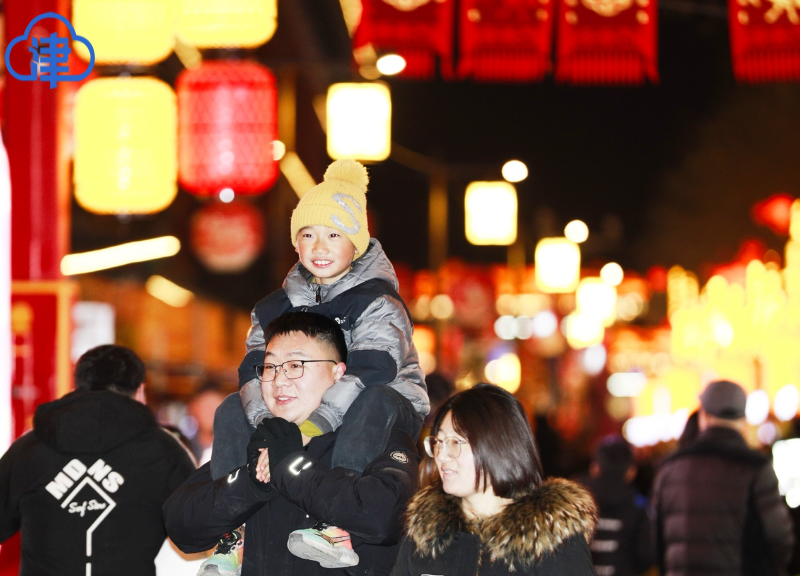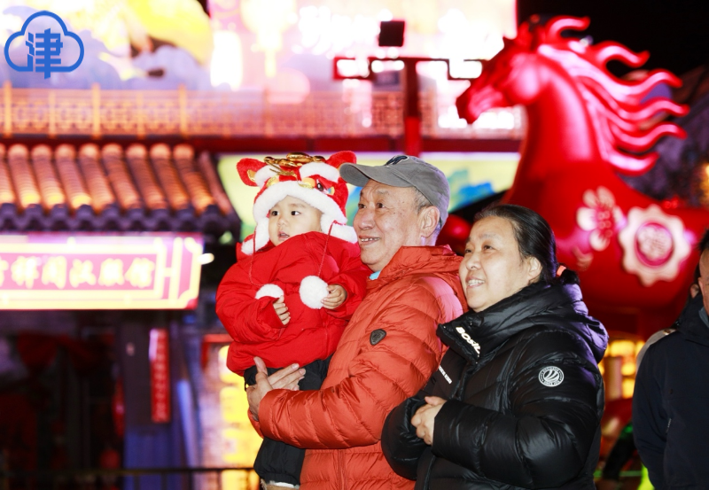 夜色中的古镇香气弥漫,特色小吃摊位前排起长龙,糖画、糖葫芦、炸糕、熟梨糕等津味特色美食香气四溢,吸引着往来游客驻足品尝。灯火之下,游人如织,大家手持小吃、边走边赏,欢声笑语在夜色中回荡,不少家庭结伴而行,在灯火与烟火气中感受别样的新春氛围。