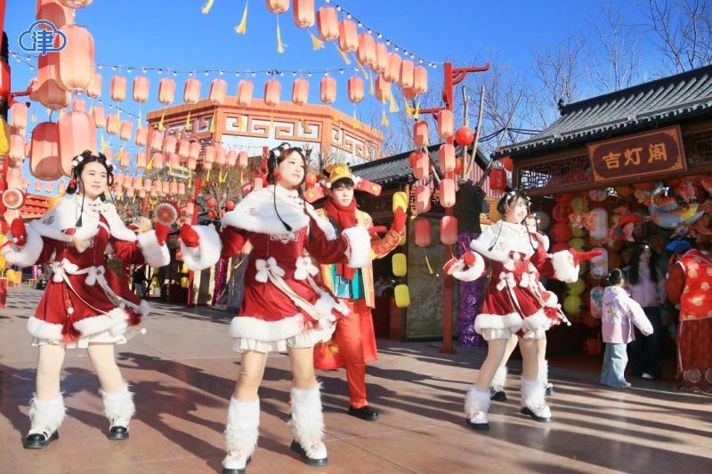 南开区双鼓(古)地区红灯笼高悬、年味氤氲,“古街寻味中国年,非遗百戏闹新春”系列文旅活动精彩上演,舞龙舞狮、汉服展演、非遗曲艺等活动吸引着天南海北的游客慕名而来。和平区五大道推出手作市集、民俗巡游等特色活动,金街商圈潮品国货与老字号礼包相映成趣,街区内人流如织、暖意融融,尽显都市文旅的时尚韵味与烟火气息。宝坻区了凡公园“宝地迎春·福耀京畿”花灯展、“龙凤和鸣”飞行表演点亮新潮体验。武清区南湖公园彩灯摇曳,多彩演艺与新春市集交织成亲子欢场。河北区北宁公园新春游园会,让游客沉浸式感受怀旧年味。河东区津一PARK新中式市集,舞狮腾跃带来新气象。泰达航母“盛宴启新春?骏跃展宏图”新春国潮嘉年华、方特欢乐世界“哏儿都闹新春”主题活动、欢乐谷“津门喜市”和大型无人机灯光秀,广受亲子家庭青睐。