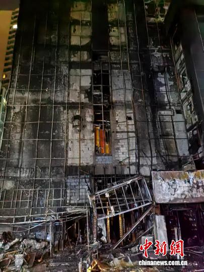 图为大面积过火后的建筑东侧楼体外墙。 陆祁国 摄