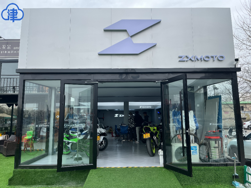 张雪机车天津西青店,位于西青区101汽车文化园,这里紧邻外环南路和津港高速。店面开在汽车园的醒目位置,面积不算太大,整体为玻璃落地通透设计,门面上是白色的张雪机车LOGO和“ZXMOTO”字样。店里摆放着几台主力车型,还有本次在葡萄牙夺冠的法国车手瓦伦丁·德比斯的画像。走近车辆,只见硕大的机身,粗壮的轮胎,炫酷的外形,给人威风霸气的压迫感。