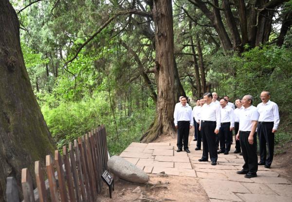 2023年7月25日下午,习近平在四川省广元市剑阁县翠云廊考察,沿古道步行察看千年古柏长势,详细询问历史上植柏护柏情况。