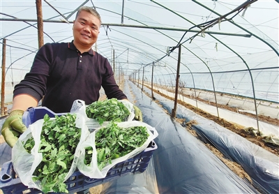 种植户徐磊把新引进的蔬菜秧苗搬进大棚。