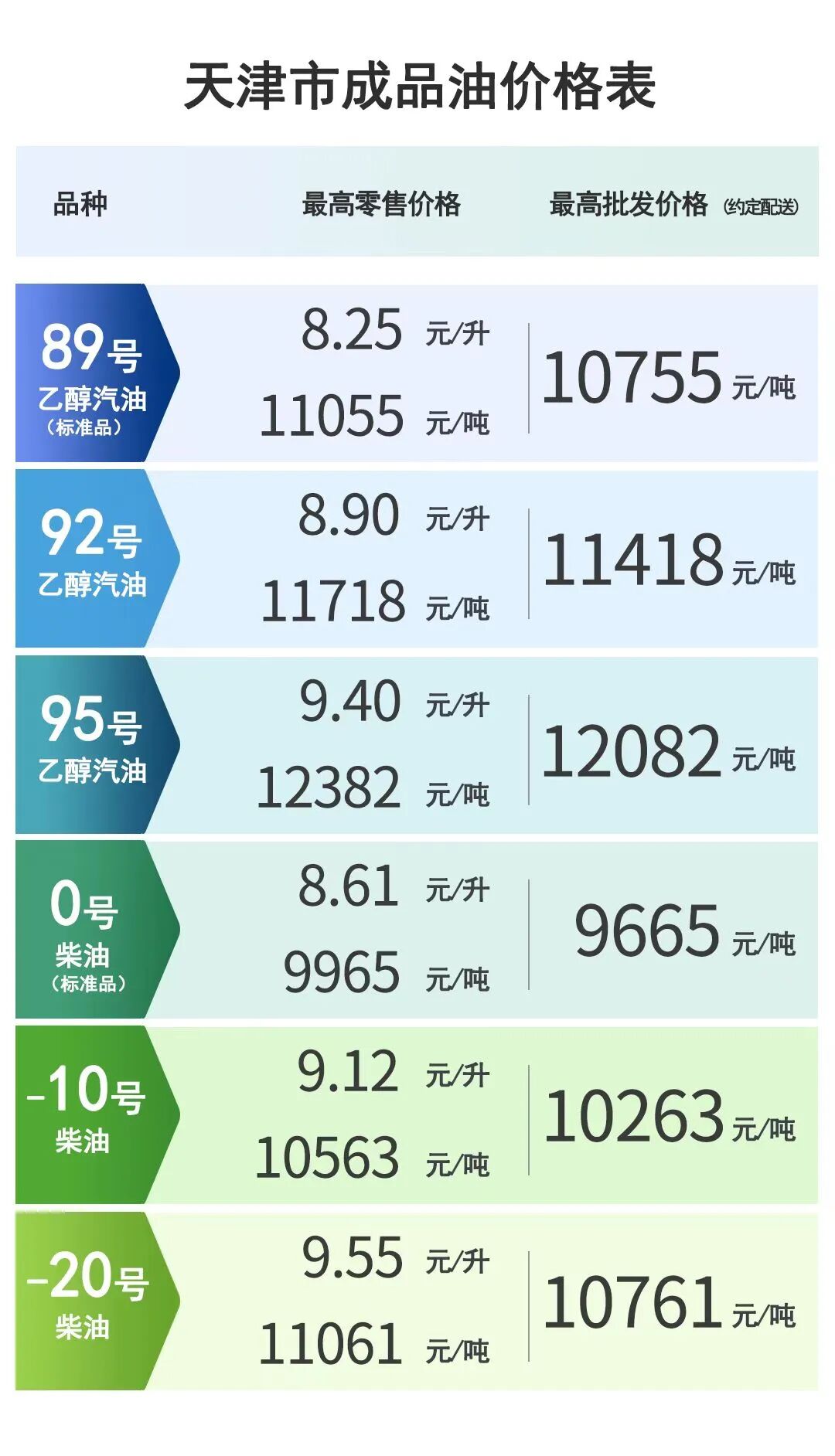 我市调整后的成品油最高零售价格每升分别为:89号汽油8.25元,上调0.31元;92号汽油8.90元,上调0.34元;95号汽油9.40元,上调0.35元;0号柴油8.61元,上调0.35元。成品油零售企业可在不超过汽、柴油最高零售价格的前提下,制定具体零售价格。(津云新闻记者 吴宏)