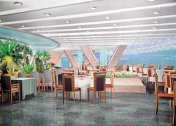 塔楼三层旋转餐厅,位于257米高空,可以在进餐的同时360度自动旋转观览市容,可容纳200人同时用餐。原为红色主色调,两层高低座位旋转,改造后变为蓝色主色调,经营航空式快餐,以阿波罗号太空船作为参照。计划顶板配宇宙星空图,服务员身着宇航服,给人仿佛置身宇宙太空舱的感觉。